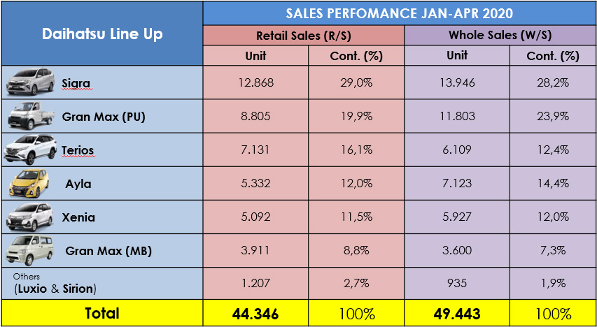 Secara total penjualan 4 bulanan, sejak Januari – April 2020, retail sales Daihatsu yang mencapai 44.346 unit dengan kenaikan pangsa pasar menjadi 18,2% dari volume retailsales nasional 243.634 unit.Sedangkan whole sales, Daihatsu catat sebanyak 49.443 unit dengan pangsa pasar naik menjadi 20,2% dari volume whole sales nasional 244.762 unit.